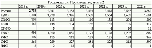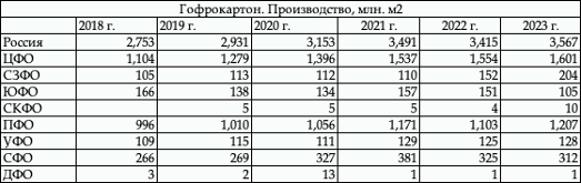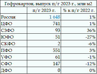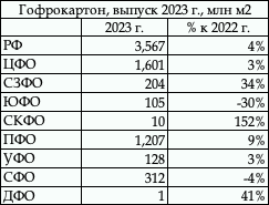 Таблица. Итоги п/г 2023 г. по выпуску гофрокартона по ФО РФ в млн. м2