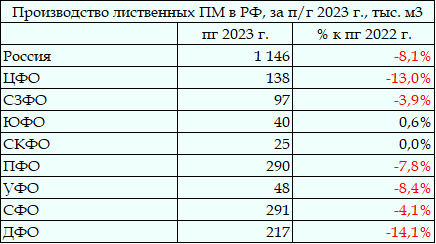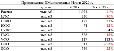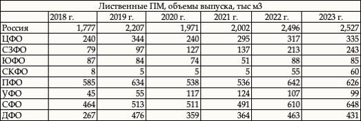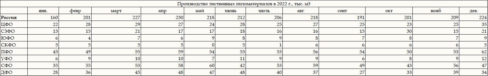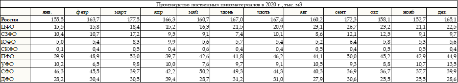 Таблица. Производство лиственных пиломатериалов по ФО РФ, начиная с 2018 г.