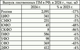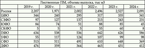 По итогам 2024 г. выпуск лиственных пиломатериалов в стране