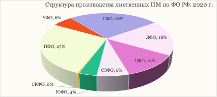 Производство лиственных пиломатериалов по федеральным округам, 2020 г.