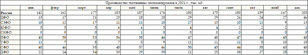 Таблица. Пиломатериалы лиственные. Объемы выпуска по ФО РФ, 2021 г.