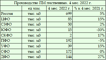 Таблица. Пиломатериалы лиственные. Объемы выпуска по ФО РФ, 4 мес. 2022 г.
