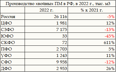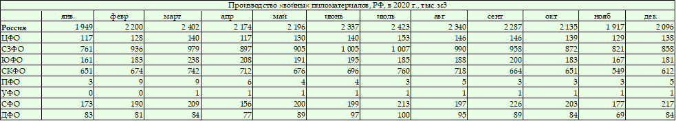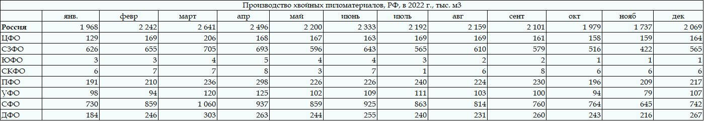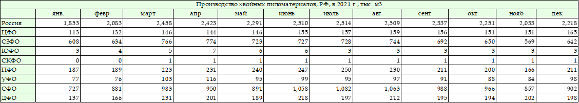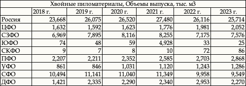 Таблица. Производство хвойных пиломатериалов по федеральным