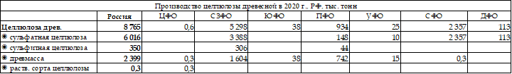 Производство сульфатной целлюлозы лидирует в совокупном выпуске древесной целлюлозы. Наиболее высокие объемы выпуска сульфатной целлюлозы зафиксированы в СЗФО, 59%. В СФО выпускают 36% сульфатной целлюлозы. Древесную массу в наибольших количествах также производят в СЗФО, доля 64%. Второе место занимает ПФО, доля 34%.