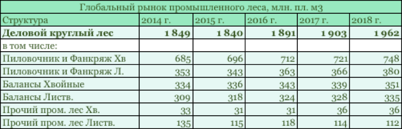 Таблица. Мировое производство необработанной древесины промышленного назначения. Структура и динамика выпуска за последние пять лет