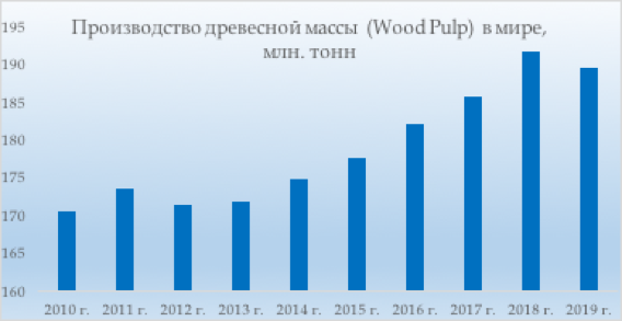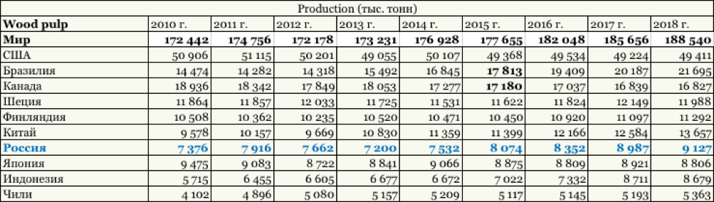 Таблица. Глобальное производство древесной целлюлозы, ведущие страны-производители, динамика объемов выпуска в млн. тонн, за последние пять лет