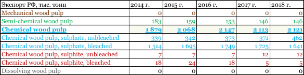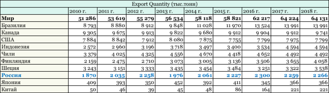 Таблица. Ведущие страны-экспортеры древесной целлюлозы, динамика объемов экспорта древесной целлюлозы, в млн. тонн, за последние пять лет