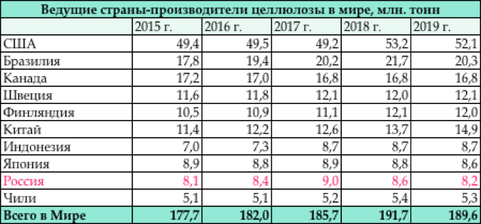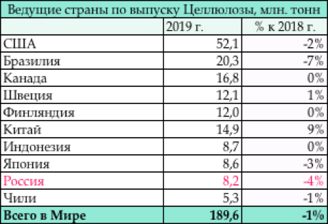 Таблица. Глобальное производство древесной целлюлозы, ведущие страны по объемам выпуска. Итоги 2019 г.