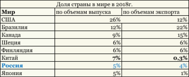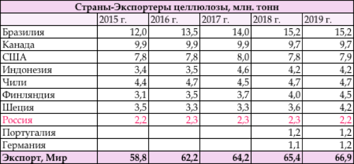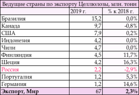 Таблица. Ведущие страны-экспортеры древесной целлюлозы. Итоги 2019 г.