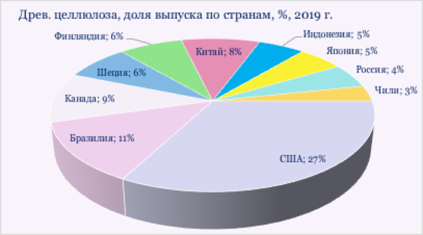 Диаграмма. Доли стран в мировом выпуске древесной целлюлозы. Итоги 2019 г.