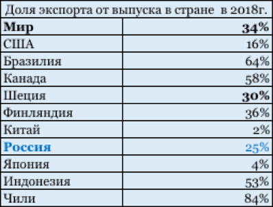 По каждой стране - Доля экспортных поставок древесной целлюлозы от объема производства в стране
