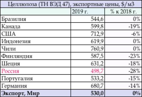 Таблица. Ведущие страны-экспортеры древесной целлюлозы, экспортные цены, (среднее значение за год, в $/тонн). Итоги 2019 г.
