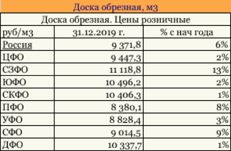 Таблица. Розничные цены на Обрезную доску. Итоги 2019 г., изменение цен за период с начала года