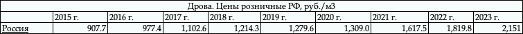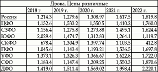 Потребительские цены (среднее по России) на Дрова последние пять лет росли умеренными темпами. Напомним, что в 2018 г. и в 2019 г. Дрова в целом по России подорожали на 10% и на 5% соответственно. В 2020 г. розничные цены выросли на 2%. По итогам 2021 г. рост цен на Дрова был существенным и составил 24%. Таблица. Динамика розничных цен на дрова