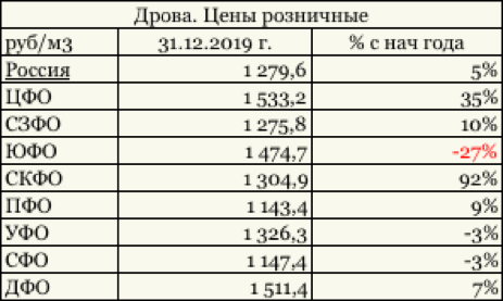 Интересно отметить, что на протяжении периода с 2005 г. по 2010 год цены на Дрова росли высокими темпами. Например, за 2006 год Дрова подорожали на 27%, в следующем году еще на 14%, после чего в кризисный 2008 год цены вновь выросли на 24%. В 2009 году рост продолжился, составив 13%. И только, в 2010 году рост цен замедлился, после чего было отмечено падение цен на 3%. За последние пять лет значительный рост цен на Дрова был зафиксирован в 2013 году - цены за тот год выросли на 14%. В 2014 г. и 2015 г. дрова подорожали на 3% и 7 % соответственно. Таблица. Розничные цены на Дрова. Итоги 2019 г., изменение цен за период с начала года