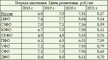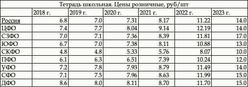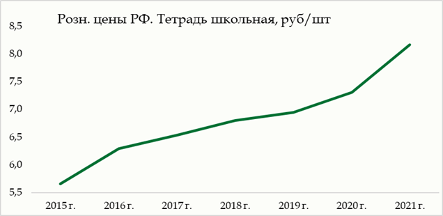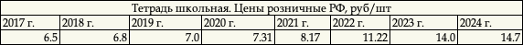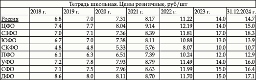 Розничные цены на тетрадь школьную в среднем по стране за 2024 г. выросли на 5%, составив на конец периода 14,7 руб. за штуку. За предыдущие два года на школьные тетради был зафиксирован высокий уровень розничных цен.