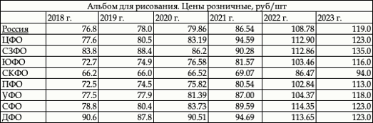 В 2023 г. Альбом для рисования в розничной сети в среднем по
