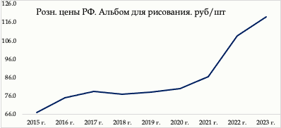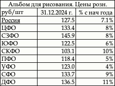 В 2024 г. розничные цены на «Альбомы для рисования» в среднем по стране за выросли на 7%, составив на конец периода 127,51 руб. за штуку. В 2023 г. рост цен на данную продукцию превысил 9%.