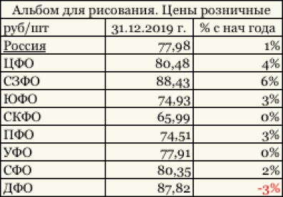 Таблица. Розничные цены на Альбомы для рисования. Итоги 2019 г., изменение цен за период с начала года