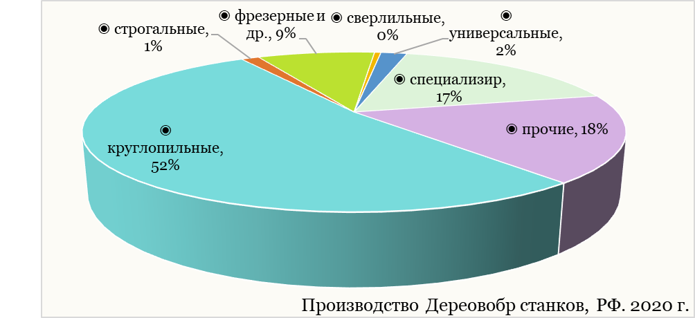 В России по состоянию на 2021 год наиболее широко представлено производство круглопильных деревообрабатывающих станков - "Станки деревообрабатывающие круглопильные, ленточнопильные и лобзиковые". На долю выпуска таких станков в настоящее время приходится 52% от объема выпуска всех д/о станков в стране. Лидером по уровню производства таких станков выступает Сибирский ФО, доля 72 процента.