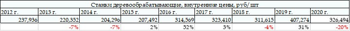 Итоги 2019 г. Средневзвешенные цены производителей России на деревообрабатывающие станки различных видов для реализации на внутреннем рынке по состоянию на декабрь 2019 г. соответствовали уровню 407,27 тыс. рублей за единицу оборудования, за период с начала года станки для деревообработки подорожали на 31%. При этом цены на деревообрабатывающие станки производителей Центрального ФО с начала года выросли в цене на 81%, составив на конец 2019 г. в среднем 525 тыс. руб. за ед. В тоже время станки для деревообработки, которые производят на предприятиях Приволжского ФО за год подорожали всего на 9% до 360,18 тыс. руб. за ед.