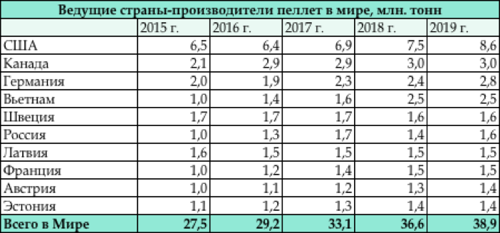 Таблица. Глобальное производство пеллет, ведущие страны-производители. Итоги 2019 г.