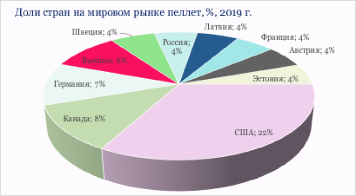 Диаграмма. Доли стран в мировом выпуске пеллет. Итоги 2019 г.