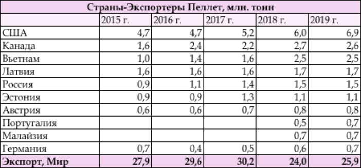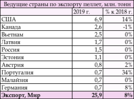 Таблица. Ведущие страны-экспортеры пеллет. Итоги 2019 г.