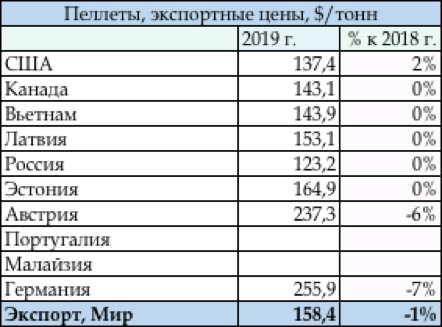 Таблица. Ведущие страны-экспортеры пеллет, экспортные цены, (среднее значение за год, в $/тонн). Итоги 2019 г.