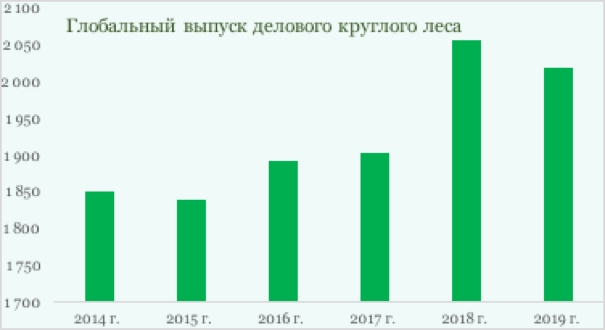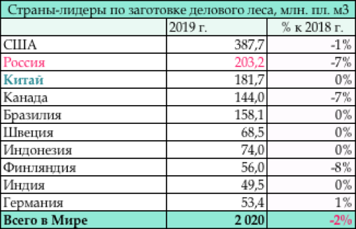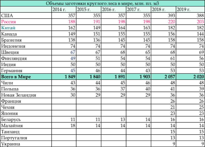 Таблица. Глобальное производство круглого леса, ведущие страны по лесозаготовке. Итоги 2019 г.