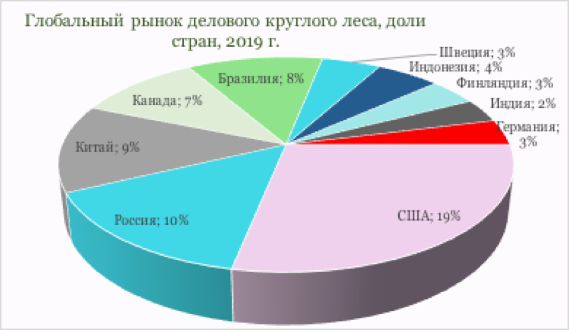 Диаграмма. Доли стран в мировом выпуске круглого леса. Итоги 2019 г.