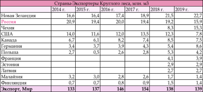 Таблица. Ведущие страны-экспортеры круглого леса, динамика объемов экспортакруглого леса,в млн. пл. м3, за последние пять лет