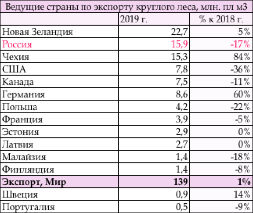 Таблица. Ведущие страны-экспортеры круглого леса. Итоги 2019 г.
