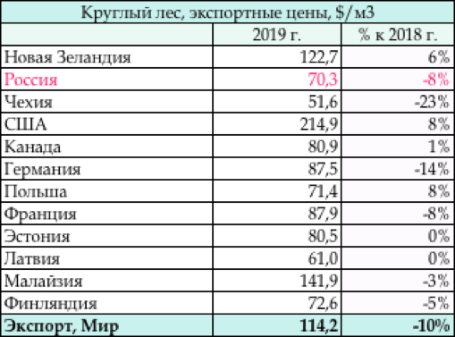 Таблица. Ведущие страны-экспортеры круглого леса, экспортные цены, (среднее значение за год, в $/м3). Итоги 2019 г.