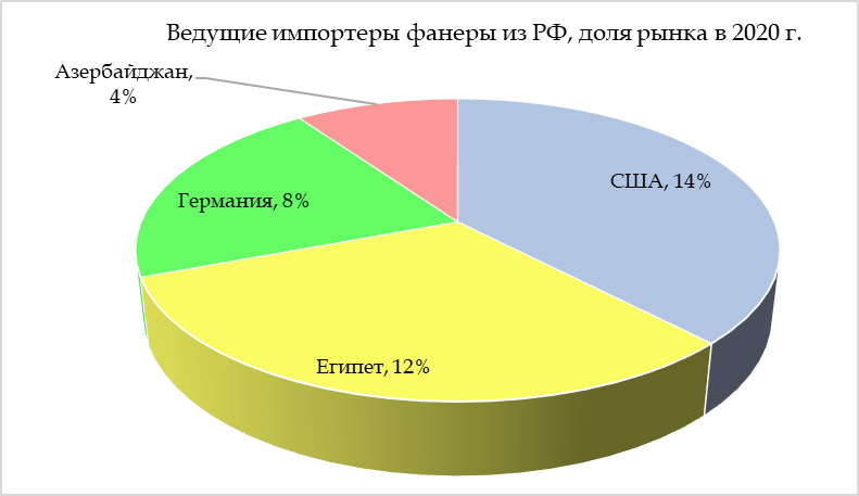 4412-М3-ФАНЕРА КЛЕЕНАЯ, ПАНЕЛИ ФАНЕРОВАННЫЕ И АНАЛОГИЧНЫЕ МАТЕРИАЛЫ ИЗ СЛОИСТОЙ ДРЕВЕСИНЫ Главное направление российского экспорта березовой фанеры – США, Египет и Германия. Значительные по объемам поставки фанеры отечественные экспортеры осуществляют также в такие страны, как Азербайджан, Финляндия, Нидерланды, Польша, Великобритания, Италия, Эстония, Латвия, Казахстан, Дания и другие страны. Диаграма. Долевое рапределение объемов импорта российской фанеры по ведущим импортерам в 2020 г.