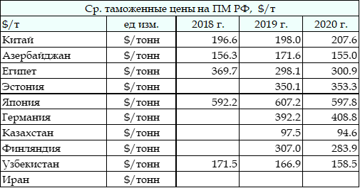 Таблица. Динамика средневзвешенных цен на поставки ПМ из РФ