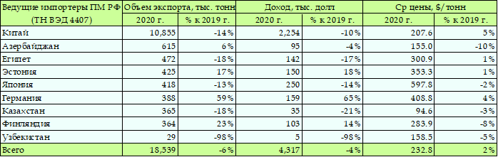 ** В таблице за 9 мес. 2022 г. нет данных по объемам поставок ПМ в Японию, Казахстан и Иран Таблица. Ведущие импортеры российских пиломатериалов в 2020 г.
