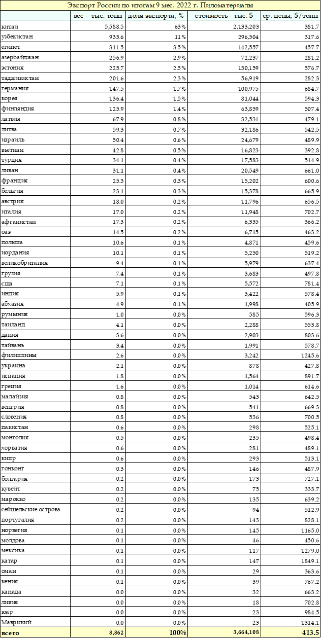Таблица. Все импортеры российских пиломатериалов в 9 мес. 2022 г.