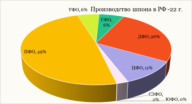 Диаграмма. Долевое распределение объемов выпуска шпона по ФО РФ