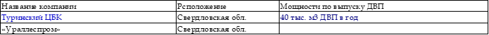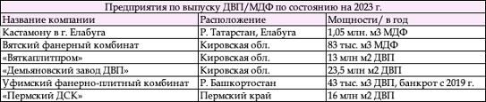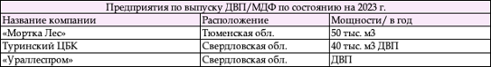Предприятия УФО по состоянию на 2023 г.Таблица. Предприятия по выпуску ДВП/MDF