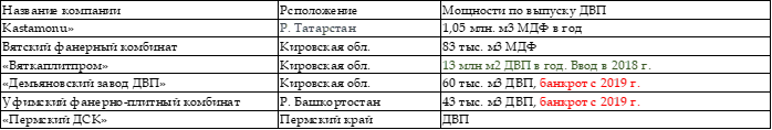 2022 г. Таблица. Предприятия по выпуску ДВП/MDF