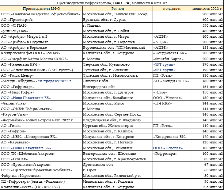 Таблица 1. Предприятия по выпуску гофрокартона в ЦФО