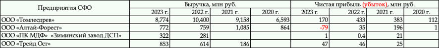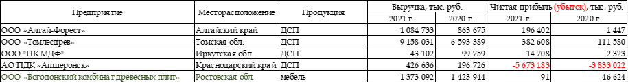 Таблица. Ключевые финансовые итоги предприятий СФО и ЮФО по выпуску плит ДСП