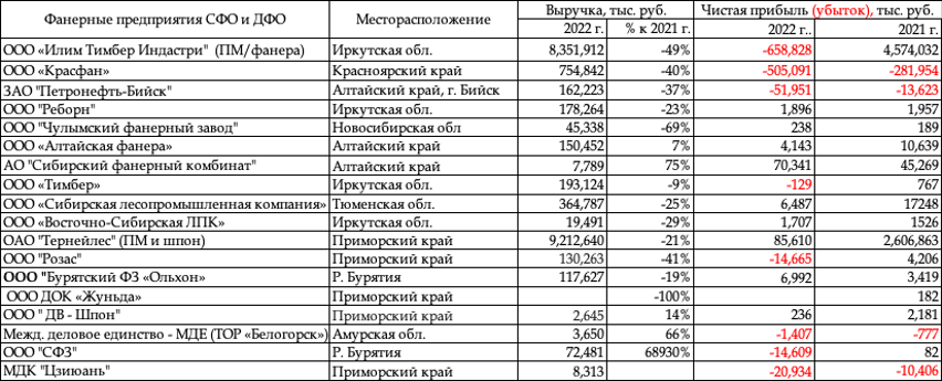 Таблица. Ключевые финансовые итоги предприятий СФО и ДФО по выпуску фанеры и шпона, а также древесных плит в 2022 г.
