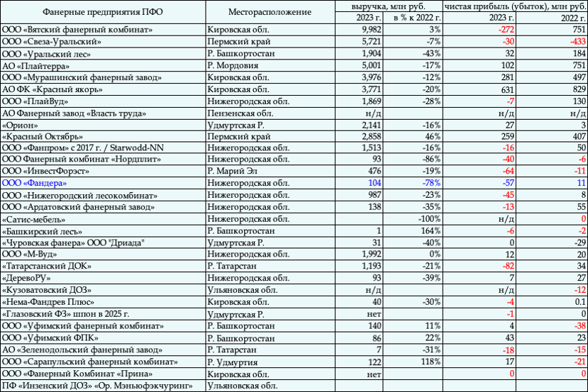 Таблица. Ключевые финансовые итоги предприятий ПФО по выпуску фанеры и шпона, а также древесных плит в 2023 г.