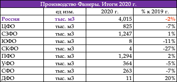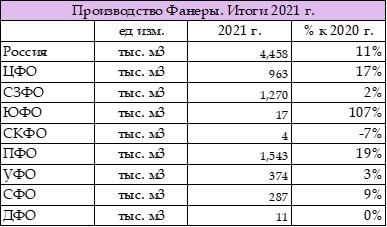 Таблица. Фанера. Объемы выпуска по ФО РФ, 2021 г.