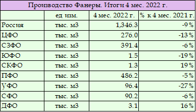 Таблица. Фанера. Объемы выпуска по ФО РФ, 4 мес. 2022 г.