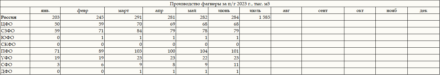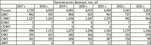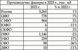 Таблица. Фанера. Объемы выпуска по ФО РФ, 2023 г.