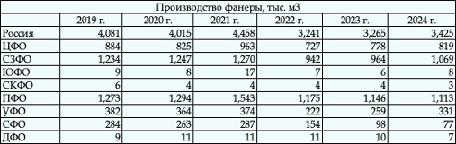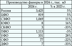 Таблица. Итоги 2024 г. по выпуску фанеры по ФО РФ в тыс.
