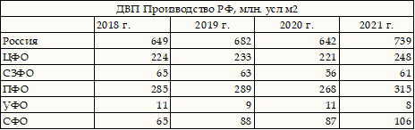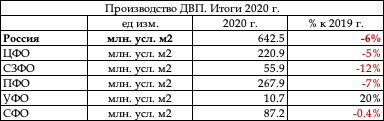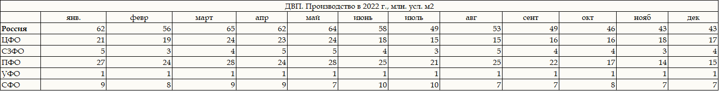 Таблица. Объемы выпуска ДВП по ФО РФ,